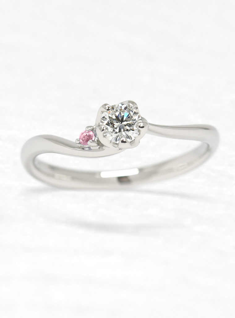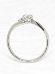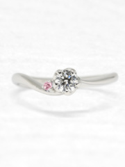 - こもも・こべにシリーズ「ほのか」は0.15~0.18ctのダイヤモンドを使用したミニエンゲージリング。リングサイドに配されたメレ石を、こももは「ピンクサファイア」・こべには「ルビー」から選べるシリーズになります。やさしい曲線に1石のピンクサファイアが添えられています。