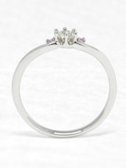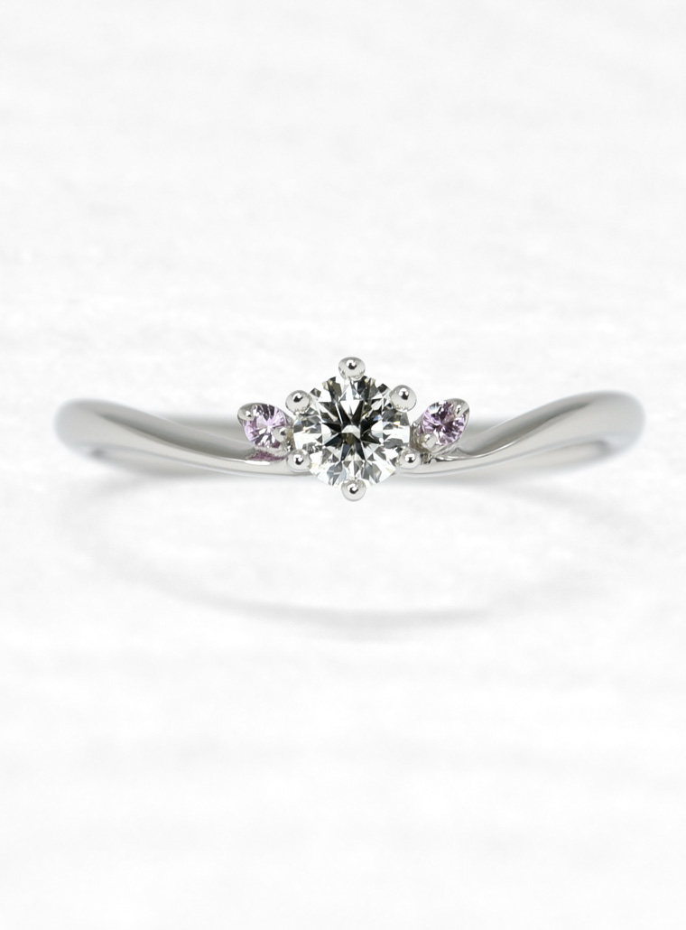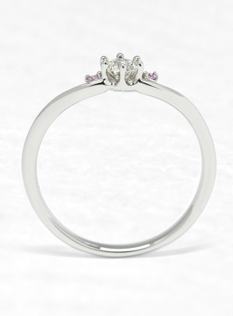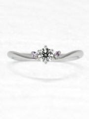 - こもも・こべにシリーズ「果実」は0.15~0.18ctのダイヤモンドを使用したミニエンゲージリング。リングサイドに配されたメレ石を、こももは「ピンクサファイア」・こべには「ルビー」から選べるシリーズになります。やさしい曲線に2石のピンクサファイアがかわいらしさを感じさせてくれる婚約指輪(エンゲージリング)。