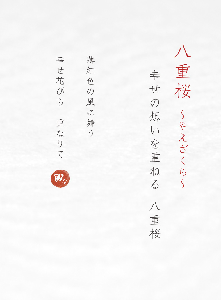 前の指輪 次の指輪 Name 婚約指輪 八重桜1 Data タイプ婚約指輪 名前八重桜 商品番号247-1 素材Pt950 ダイヤモンド0.20ct~ メレダイヤ0.03ct オプション宝石対応可能 製作期間約5週間 価格(枠のみ)¥128,700- 表示価格は税込表記となります。 Point 「八重桜」は八重桜の花びらをモチーフにした婚約指輪(エンゲージリング)。贈り&贈られたふたりに幸せが積み重なりますように。 前の指輪 次の指輪