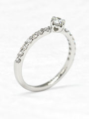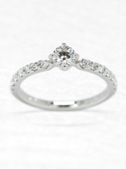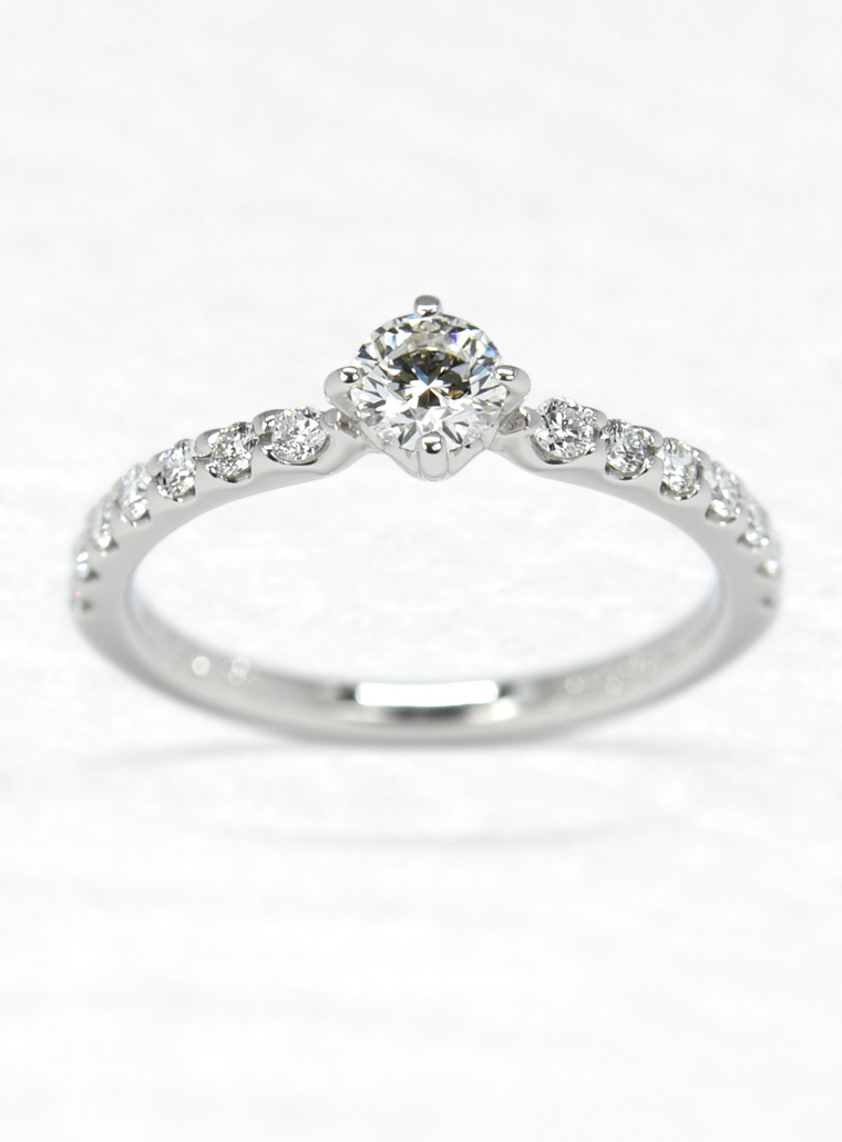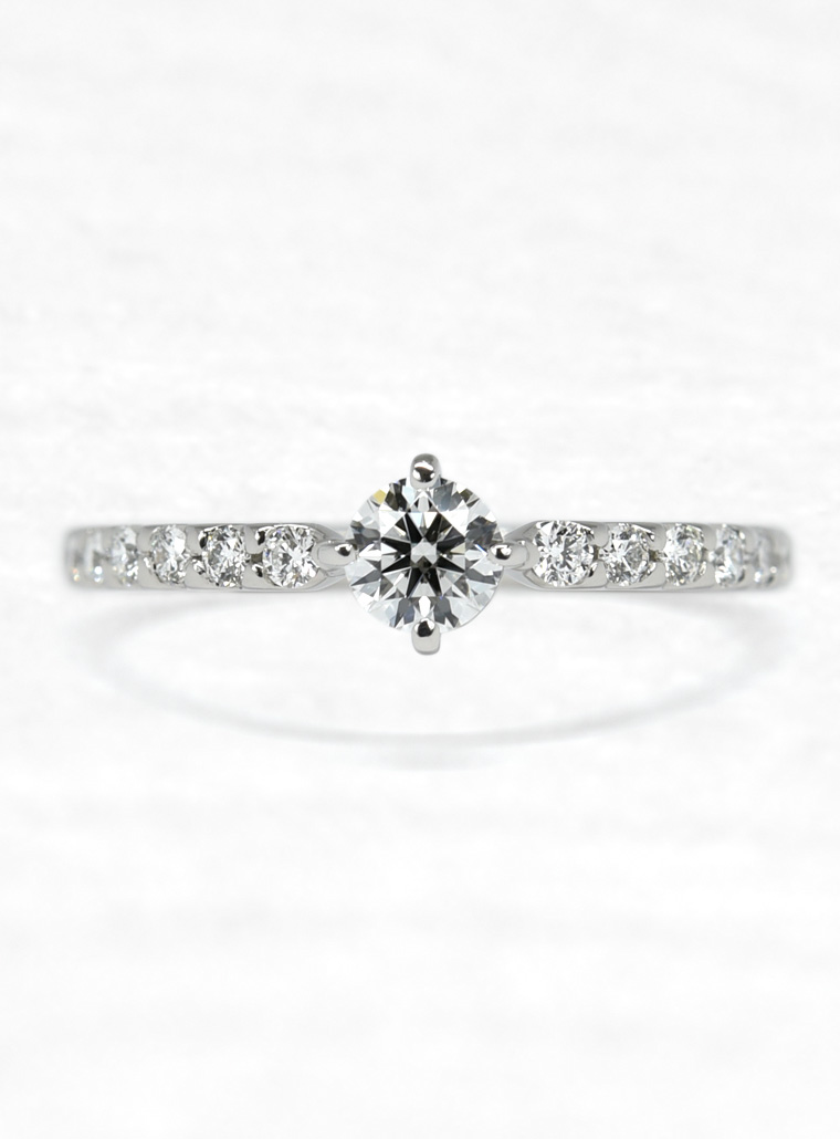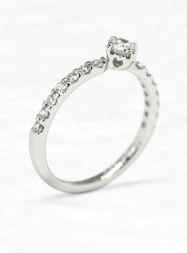 両サイドのメレダイヤモンドはリングを半分までぐるりと包み、ハーフエタニティのようなダイヤモンドの輝きに包まれた指輪です。
