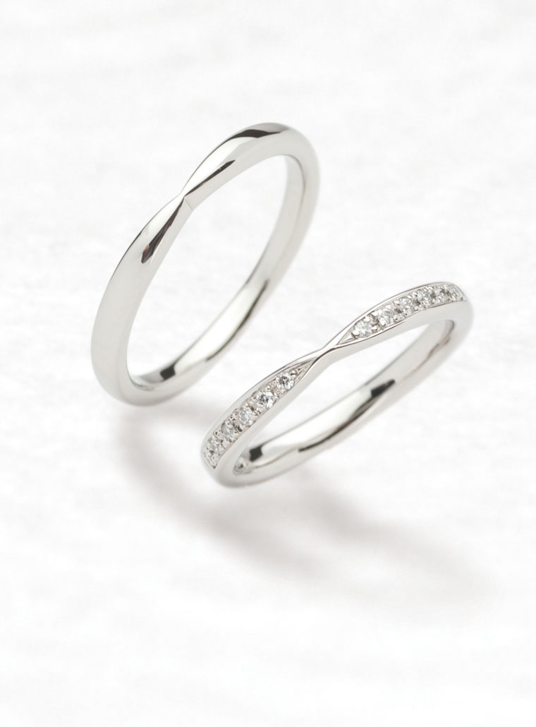 ちょうちょをモチーフにした結婚指輪。センターのくぼみから両サイドに伸びる羽をイメージして作られています。女性のリングはハーフエタニティーのようにメレダイヤモンドを一列に輝かせています。