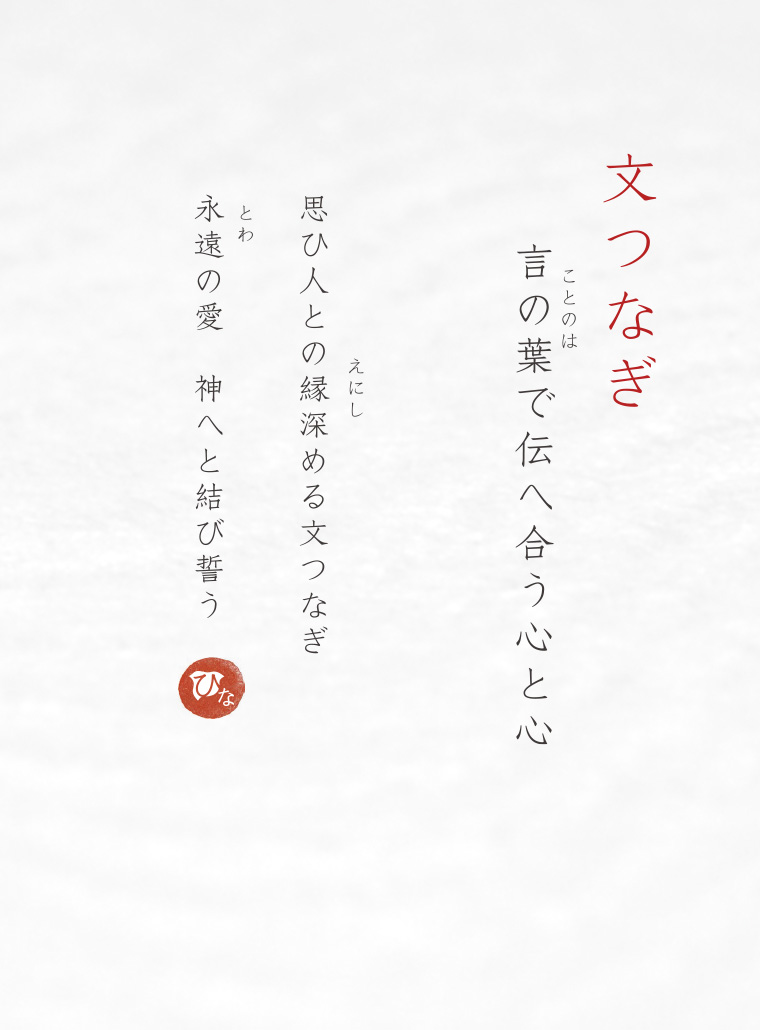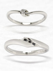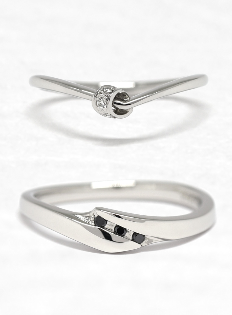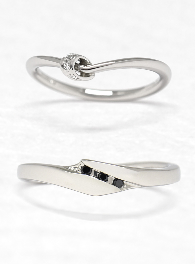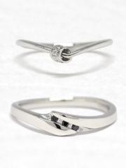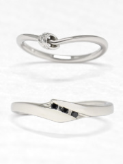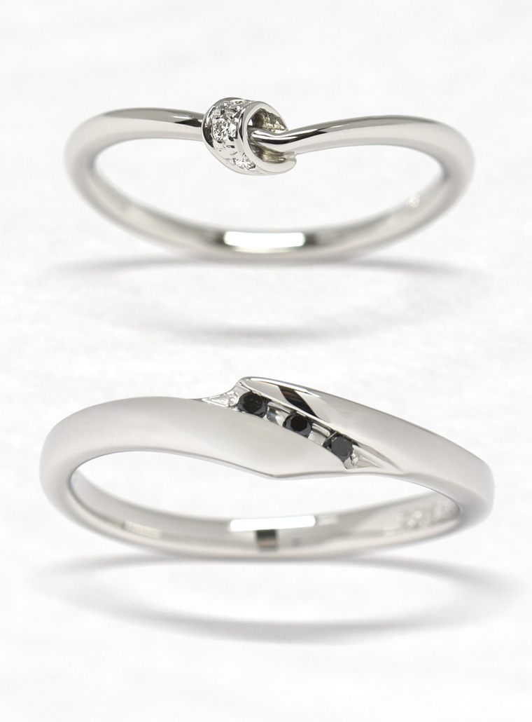 - 「文つなぎ」は恋人通しが手紙で気持ちを伝えあっていた時代、二人の気持ちを手紙に託したその思いを表現した結婚指輪です。女性にはホワイトダイヤモンドを、男性にはブラックダイヤモンドを使用しています。手紙の結び目をリングデザインに。