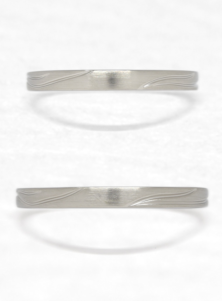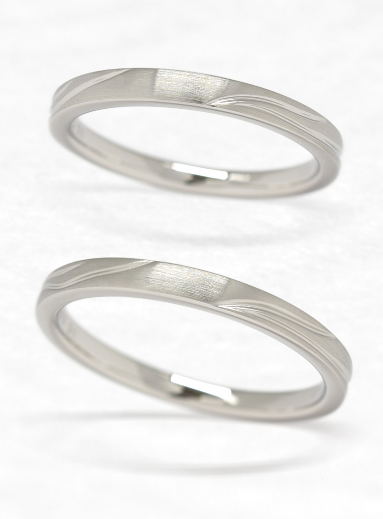 - 「風楽」は春に吹くやさしい風を表現した結婚指輪です。表面はヘアライン仕上げとデザインで春の風を表現し、女性はくぼみ部分を光りかがやくグロス仕上げに、男性はくぼみ部分をマット仕上げにすることで雰囲気を変えて身につけることができます。