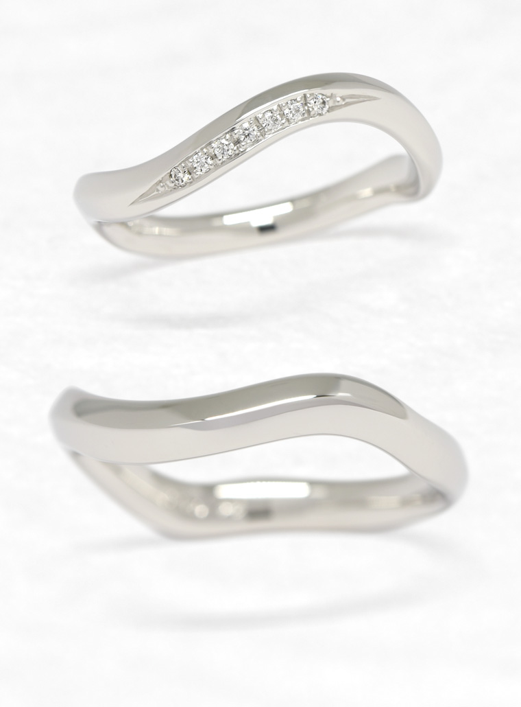 ウェーブのラインが特徴的なデザインで、男性用・女性用ともに指馴染みの良い指輪に仕上がっています。