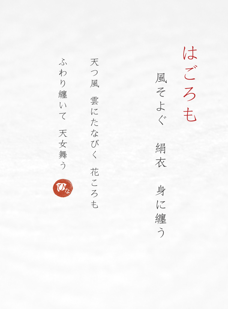 - 春の季節に吹く風で、桜と共にはごろもがふわりと舞っているようすを表現した結婚指輪。