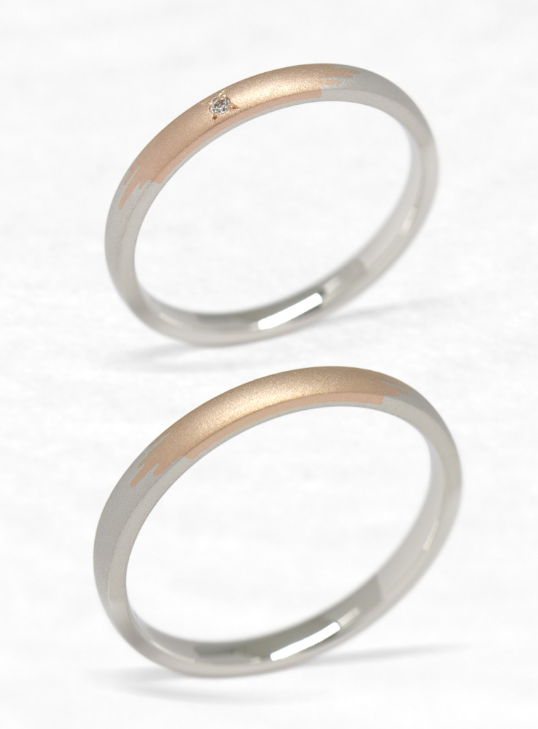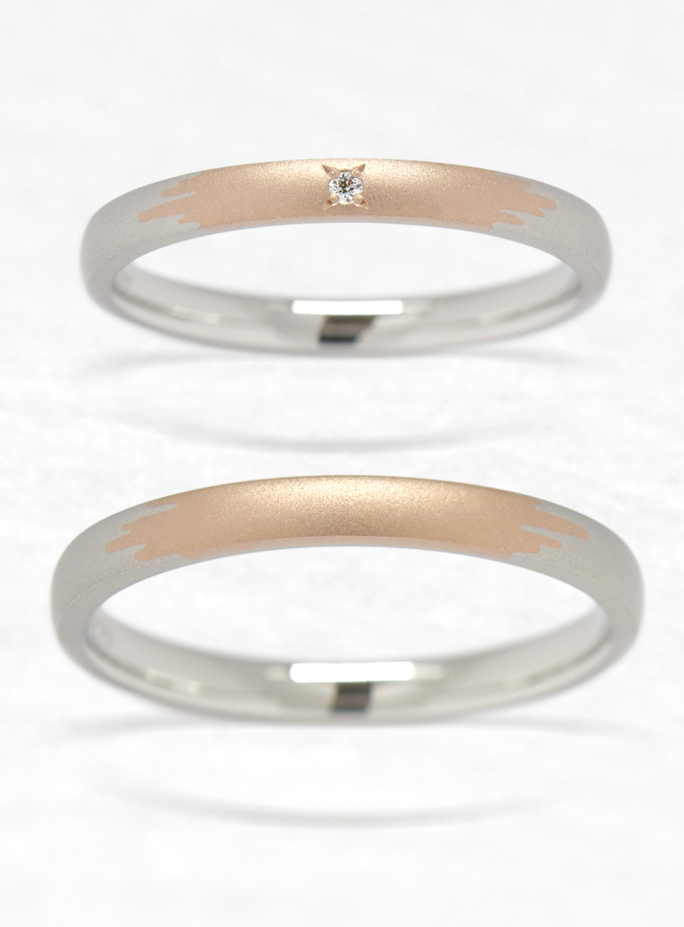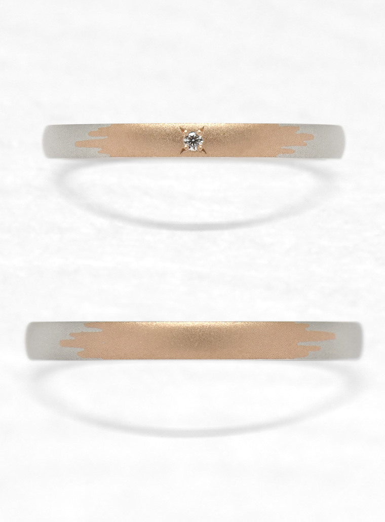 - K18ピンクゴールドとプラチナ950の2つの素材を組み合わせてデザインされた結婚指輪「かき氷」。夏の涼しさを思わせる清涼感溢れるリング。好きなシロップ(素材)や表面仕上げでふたりだけのかき氷を楽しんでください。