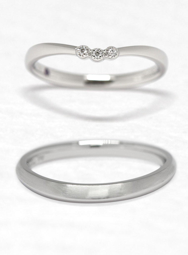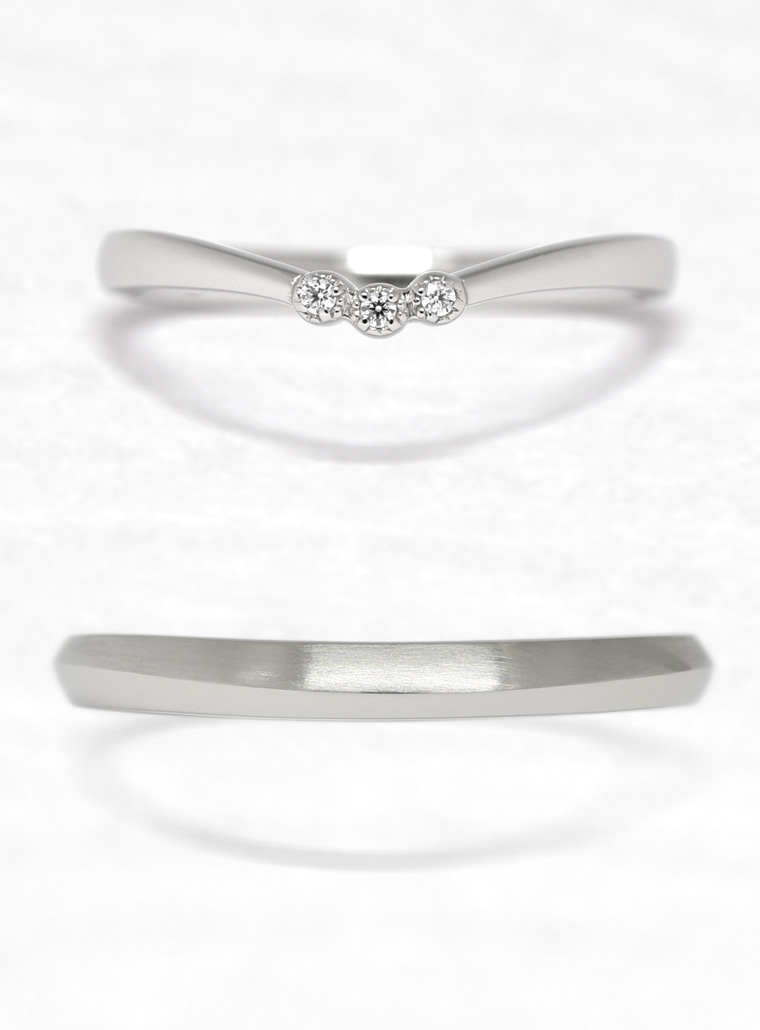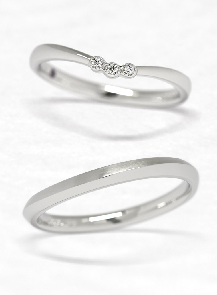 - 「みずもよう」は水面に広がっていく水模様(波紋)をイメージした結婚指輪です。3つのメレダイヤモンドには、小さなミル打ちの飾りが施されています。男性の指輪はヘアラインとグロスの2つの仕上げが施され、水模様の広がりを表現しています。