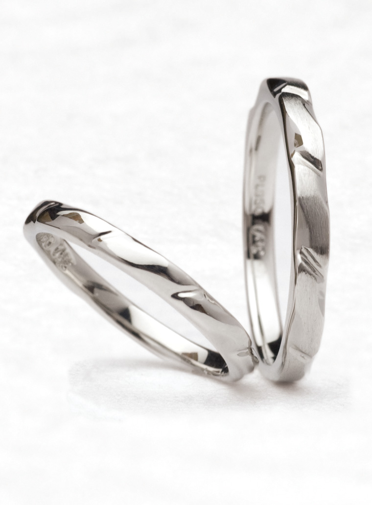 朝日に照らされたきらめく砂浜を表現した結婚指輪。女性はキラキラ光る寄せる波をイメージしたグロス仕上げ、男性は静かに返す波の穏やかさをイメージしたヘアライン仕上げ。そして寄せては返す優しい波のように穏やかでいられますように願いを込めました。