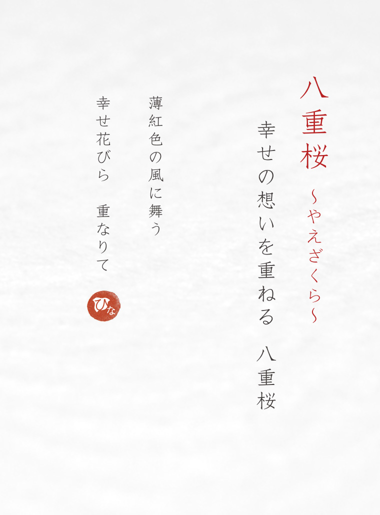 - 「八重桜」は八重桜の花びらをモチーフにした結婚指輪。2人へ幸せが何重にも幸せが積み重なりますように。婚約指輪の「八重桜」は3パターンから選べるセットリングとなっています。